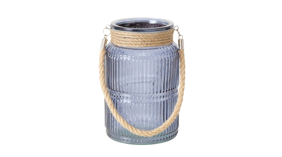 Kék bordásüveg mécsestartó kötélfüllel, 21x13,5cm – Boltze
