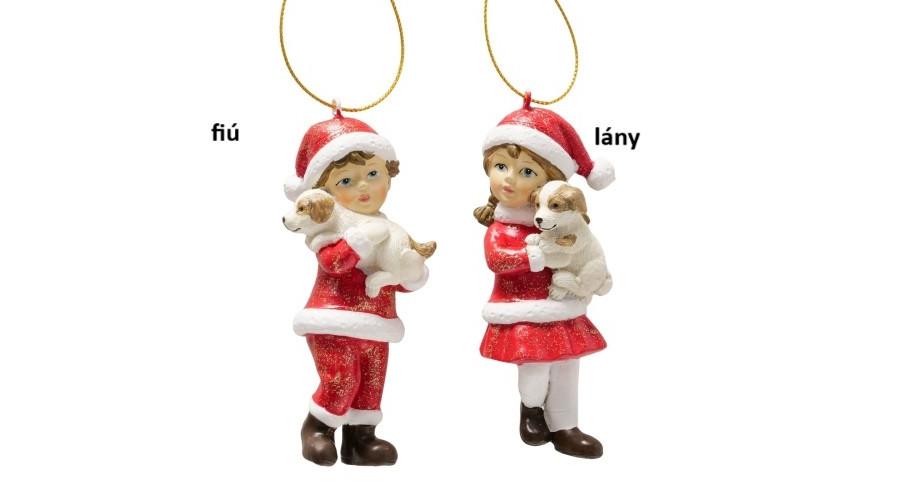 Piros ruhás kisfiú/kislány kutyával, 4,5x4,4x11,5cm, Sky – Boltze