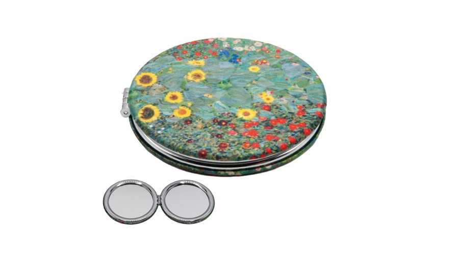 Textilbevonatú zsebtükör 7cm, nagyítós tükörrel, Klimt: Kert naprafogókkal – Fridolin