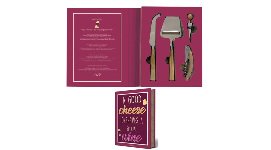 Bor-sajt készlet 4 db-os, bornyitóval, üvegzáróval, sajtkéssel és szeletelővel, Gift Novels – Easy Life-Nuova