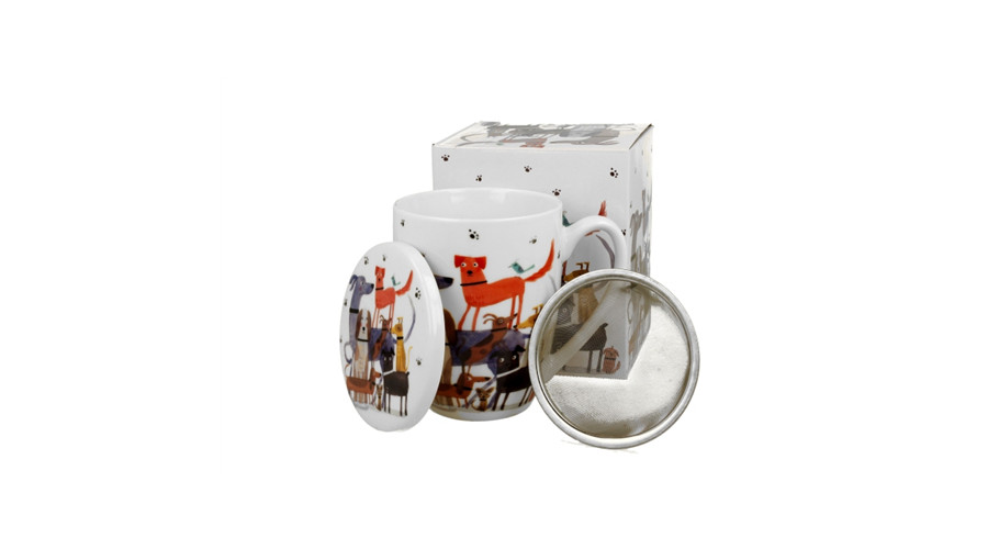 Porcelánbögre tetővel, fémszűrővel ,360ml, dobozban, Dog walk – Duo Gift