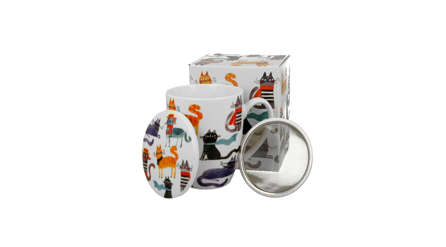 Porcelánbögre tetővel, fémszűrővel, 360ml, dobozban, Stylish Cats – Duo Gift