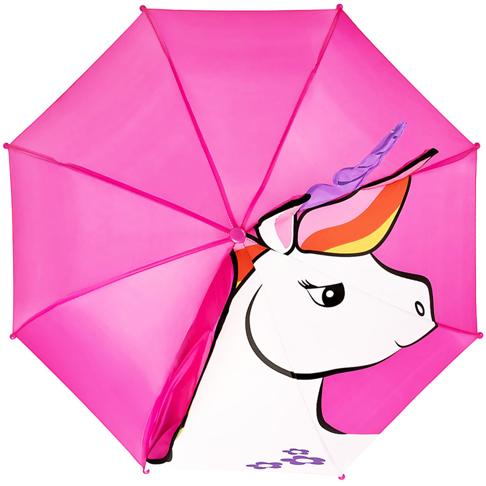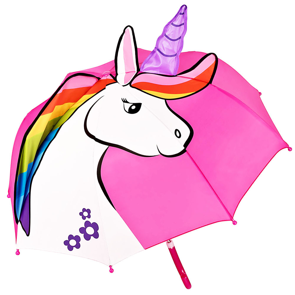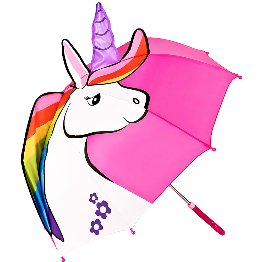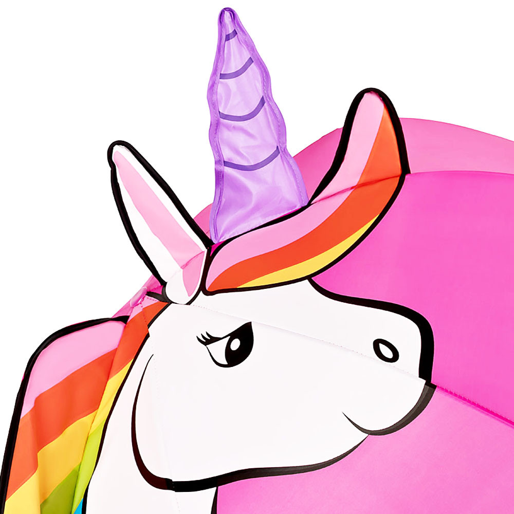 Egy gyönyörű, fehér egyszarvú, a szivárvány színeiben pompázva mosolyog a világra. A szarva és az egyik füle kiemelkedik az esernyő tetején. Így küld jó hangulatot a világra.